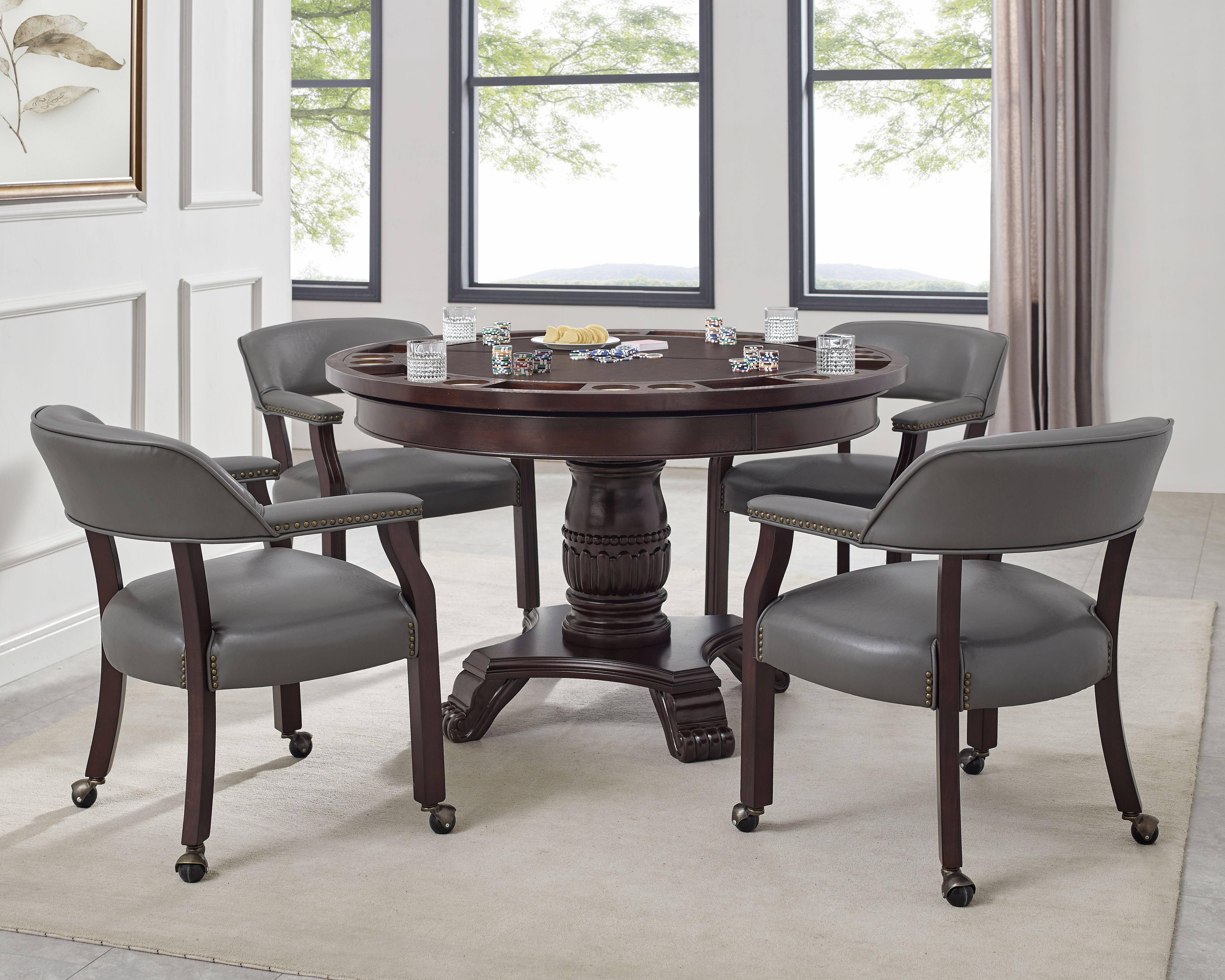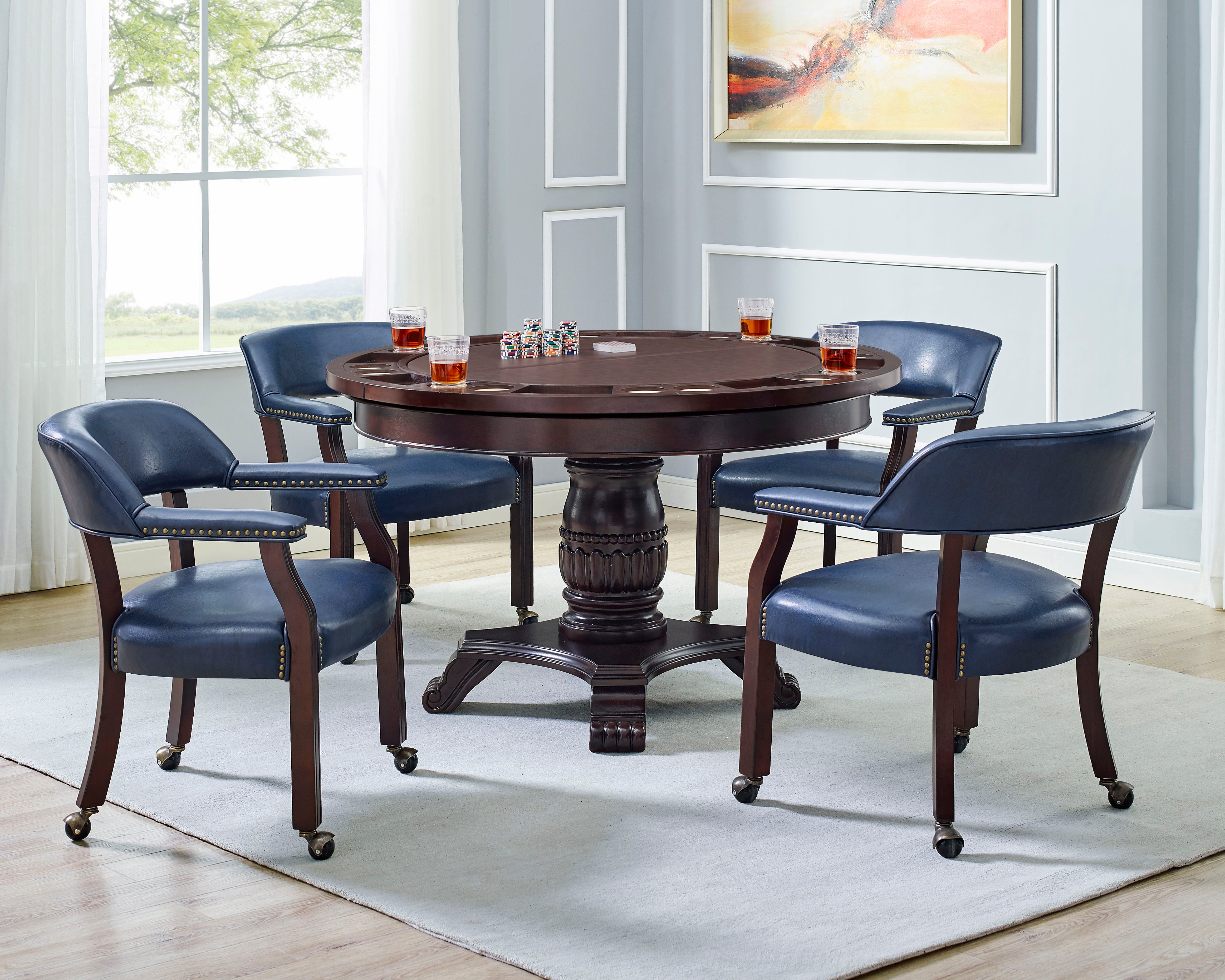 A Game Table and Chairs make both game night and dining night enjoyable! Enjoy both with the Tournament dual-purpose dining and game table. The 48-inch round table comes in a medium cherry finish and can accommodate four comfortably for dining. The dining table easily converts to a game table with the addition of the game table top that is available in faux-leather or leatherette. The game top folds and stores easily and the table goes back to a dining table. The upholstered.captain’s chair is castered for easy mobility and comes in a wide range of colors perfect for every decor.