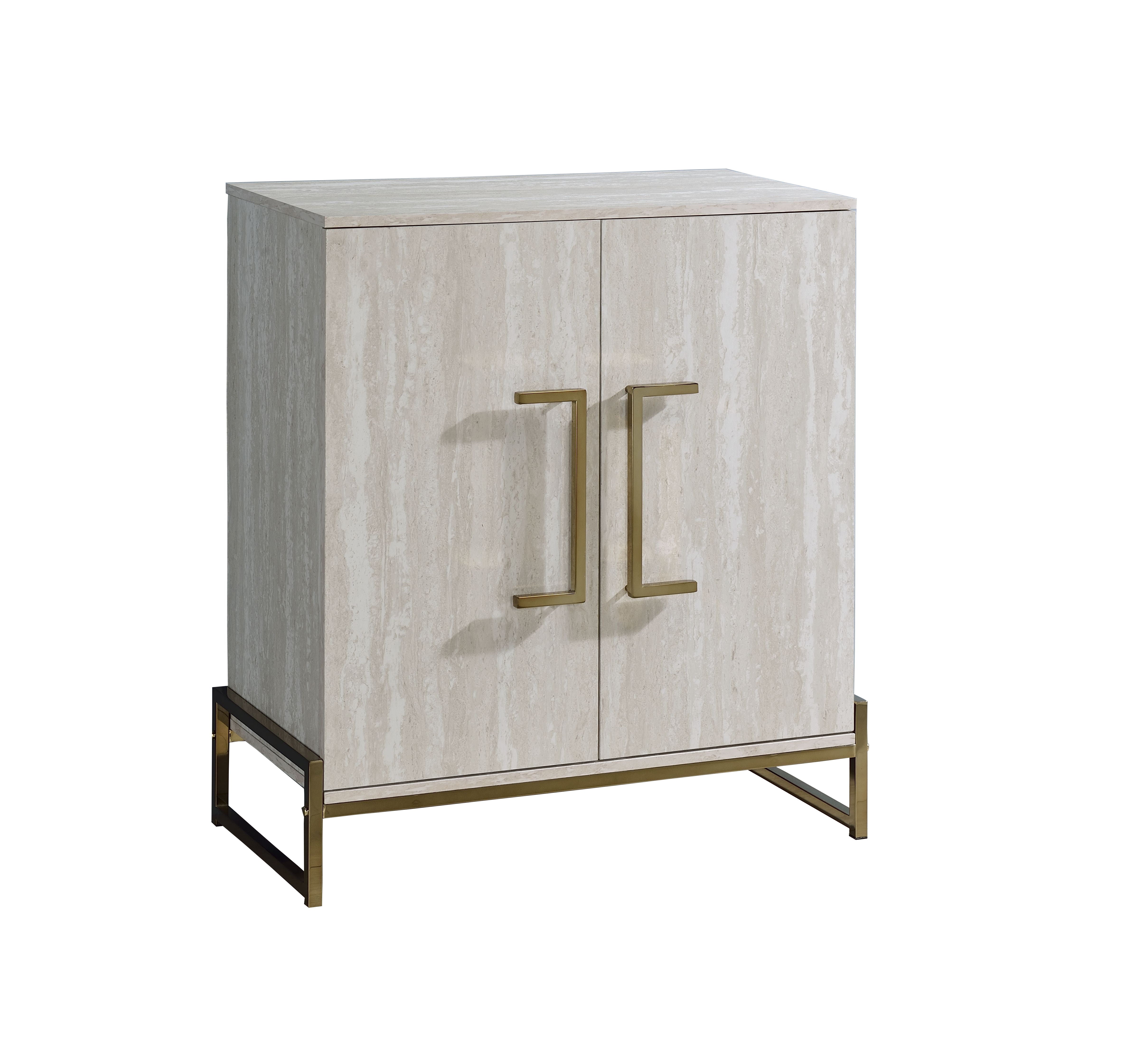Larkin presents modern elegance in a compact Wine Cabinet/Server. Frameless door hinges offer easy-open elegance to an interior full of function: dual hanging stemware racks, a bottle storage rack and four adjustable shelves. The entire unit is covered in faux marble for an upscale look that will dress up any dining or bar area. Copper colored chrome hardware on pulls and Server base add to the contemporary profile of this functional and beautiful piece.